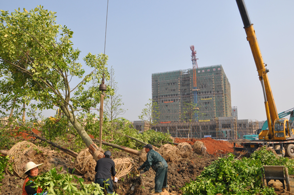 在施工现场,施工人员卸苗木、修枝叶、挖树穴、栽树苗……一派繁忙景象。据现场施工的技术人员介绍,依据校园整体规划,本次栽种的30多株树木包括广玉兰、无患子、乐昌含笑三个品种,树径普遍在15-35公分左右,26日凌晨由东湖校区运抵诸暨。