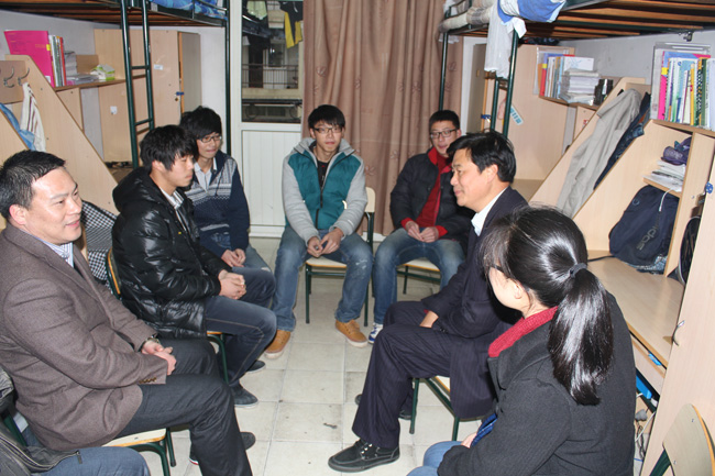 鲍滨福副校长与寝室同学坐在一起亲切交谈,逐一询问寝室同学的学习、生活情况。在听到寝室同学今后有出国深造、自主创业的规划时,鲍滨福副校长非常高兴,鼓励大家珍惜大学时光,认真学习,增长才干,朝着自己树立的目标努力奋斗,走出学校后干出一番业绩,成为学校的“名校友”,为校争光。他叮嘱同学们要多锻炼身体,提高身体素质,有意见和建议向学校提出来,学校一定会尽最大努力给同学们创造良好的学习生活环境。