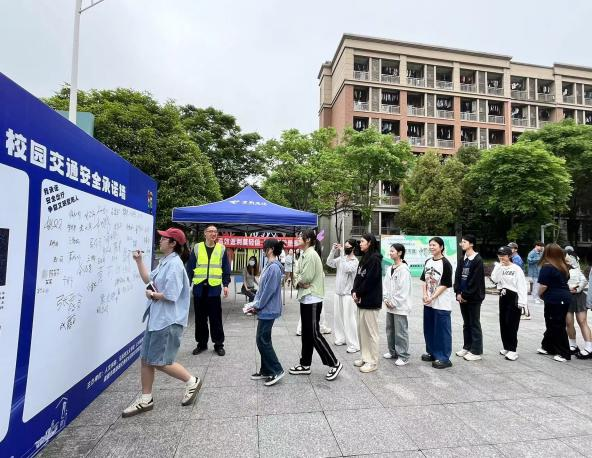 路路通安全宣传志愿服务队志愿者及辖区交警对不同类型的二轮电动车进行了安全知识讲解,学院组织校园交通安全知识答题。此外,交通安全宣传海报内容生动,既有交通规则的普及,也有交通安全事故的警示,吸引了大量师生驻足观看,并在“安全出行,争做文明暨阳人”承诺墙上签名。