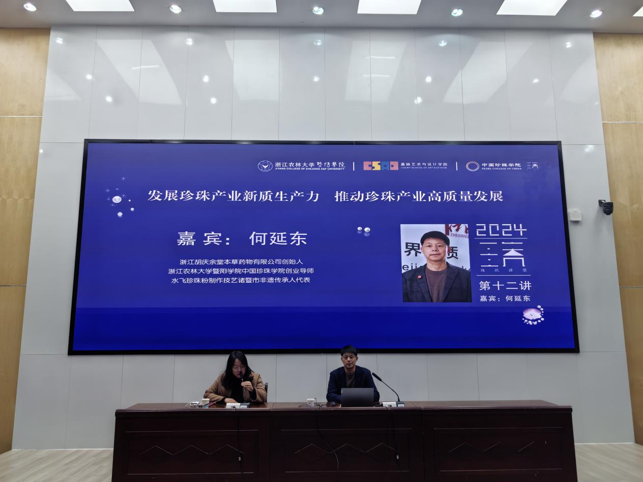 12月22日,中国珍珠学院在图书馆报告厅成功举办了“珠玑讲堂”(第十二讲)《发展珍珠产业新质生产力,推动珍珠产业高质量发展》,邀请浙江胡庆余堂本草药物有限公司创始人,同时也是学院创业导师、水飞珍珠粉制作技艺诸暨市非遗传承人代表——何延东作为主讲嘉宾。晨晓艺术与设计学院170余名师生参加了此次活动。