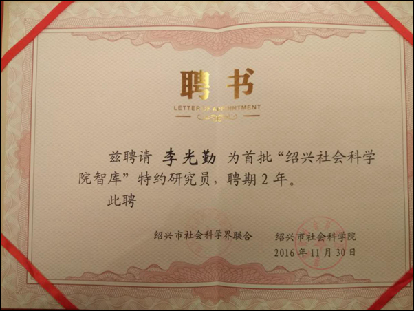 金沙官网教师被评为绍兴市社科院智库特约研究员