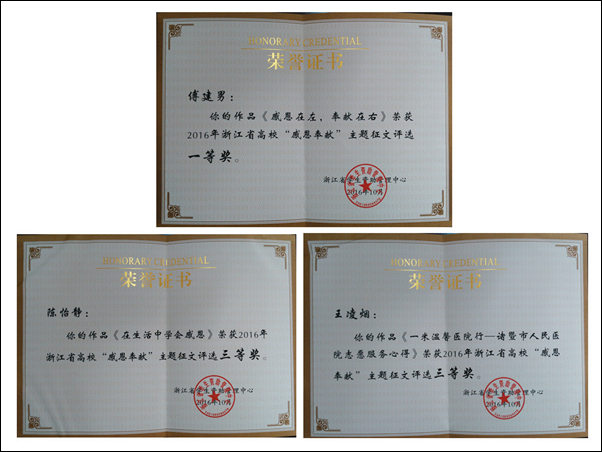 近日,由省学生资助管理中心主办的2016年浙江省高校“感恩·奉献”主题征文评选活动结果揭晓,金沙官网学子喜获佳绩。园林艺术系土木工程132班傅建男同学的作品《感恩在左,奉献在右》荣获一等奖,人文系法学141班陈怡静同学的作品《在生活中学会感恩》和公共事业管理141班王凌烟同学的作品《一米温馨医院行——诸暨市人民医院志愿服务心得》分别获得三等奖。